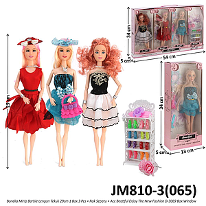 Boneka Barbie Set 3 Pcs dan Rak Sepatu Body Padat Lengan Tekuk Beatiful Enjoy The New Fashion D-3069 Box Window @32