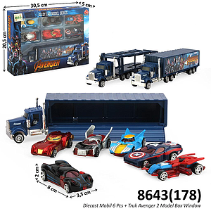 Diecast Mobil Skala Hot Wheels Avengers 6 Pcs dan Truk Trailer 2 Model (Kontainer / Pengangkut Mobil) 1:64 Box Window @48
